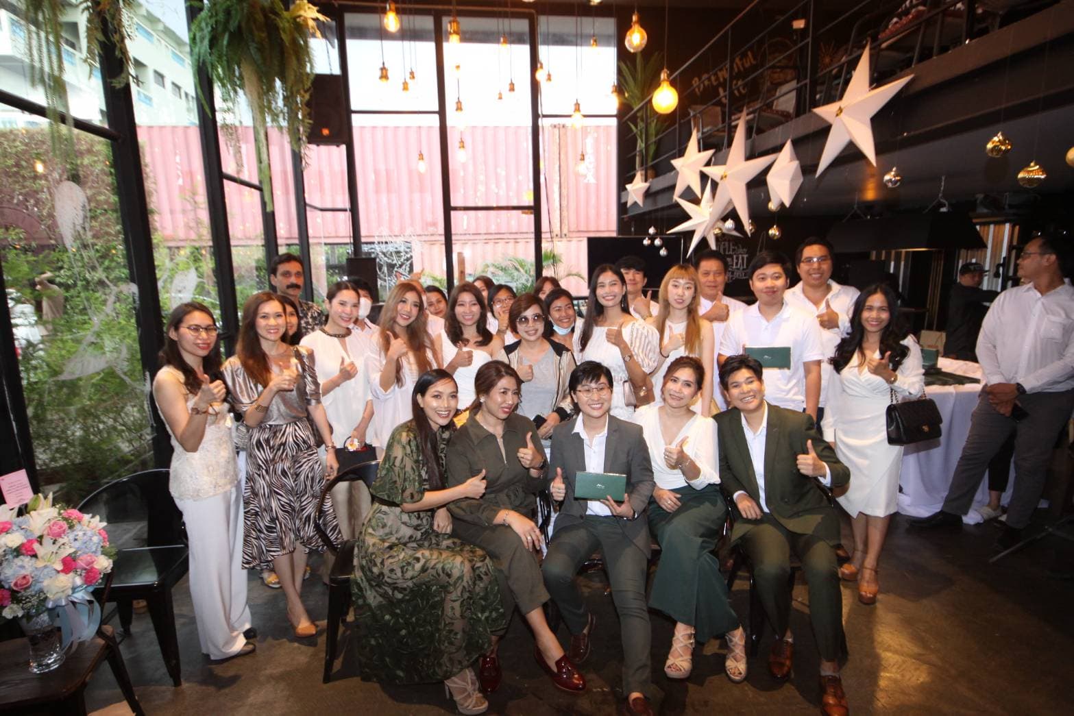 ที่ 1700 Terrace Bar & Restaurant ซอยโยธินพัฒนา 3 กลุ่มคนรักสุขภาพและสื่อมวลชนจำนวนมากเดินทางมาร่วมแสดงความยินดีกับ คุณ ภัคนันต์ จันทนวิโรจน์ , คุณ นันณิญาณ์ จันทนวิโรจน์ , คุณ ศกุนตลา พรหมสาขา ณ สกลนคร , คุณ ลินต์ณกรณ์ ธนลลินธรณ์ และ คุณ วิริยา มาลาฐิตวงศ์ สองสาวหล่อและสามสาวสวย 5 CEO เจ้าของผลิตภัณฑ์ AMLEINE(แอมลีนน์) แบรนด์ธุรกิจสุขภาพ อาหารเสริมและความงาม บนแนวคิด.