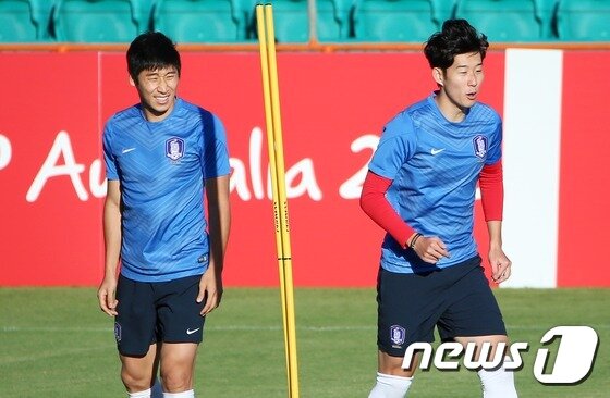 | 이근호 한국프로축구선수협회 회장(왼쪽)과 토트넘의 손흥민,. 사진은 5년 전 2015 아시아축구연맹(AFC) 아시안컵에 함께 출전한 모습. /뉴스1 © News1 오대일 기자 |